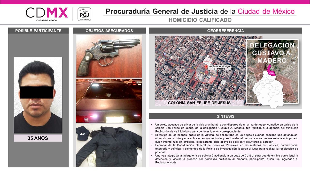 Vázquez Landeros informó que el hombre de 35 años y el arma asegurada quedaron a disposición del agente del Ministerio Público de la Fiscalía Desconcentrada de Investigación en Gustavo A. Madero, quien inició una carpeta de investigación por el delito de homicidio calificado.